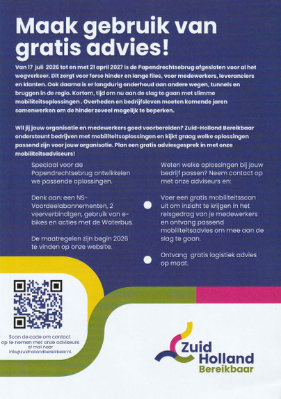 Op 28 oktober jongstleden vond een informatieve bijeenkomst plaats in het Dordrechts Museum over de sluiting van de Papendrechtse brug. Speciaal voor ondernemers biedt Zuid-Holland Bereikbaar gratis aan bedrijven te ondersteunen met mobiliteitsoplossingen. Zuid-Holland Bereikbaar kijkt graag mee welke oplossingen passend zijn voor ondernemers. U kunt een gratis adviesgesprek inplannen via de onderstaande QR Code of direct via deze webpagina.